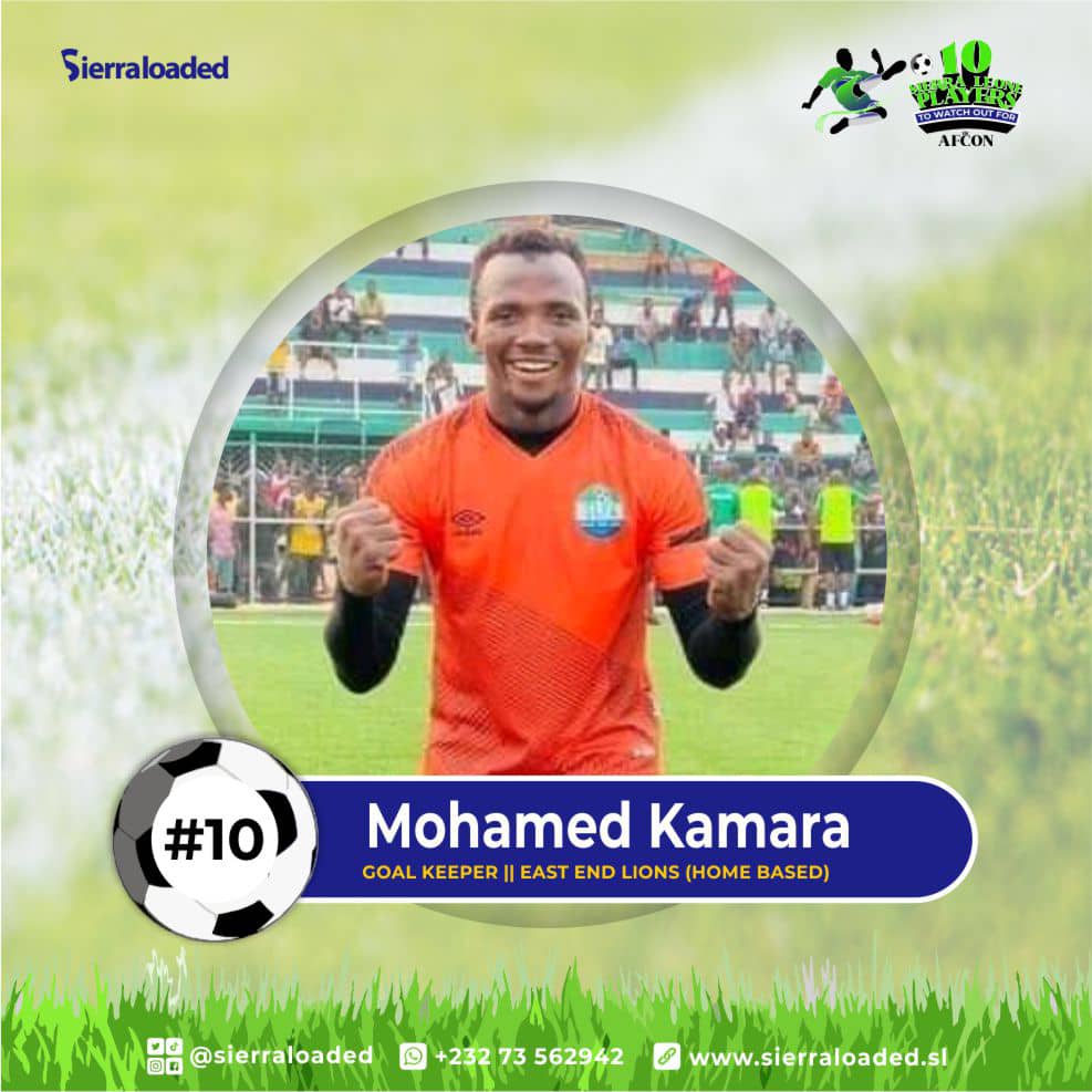 Mohamed Kamara is Sierra Leonean Homebased goal keeper. He is a current stopper for East Lions Football Club and currently serves as first choice Goalkeeper for Leone Stars.