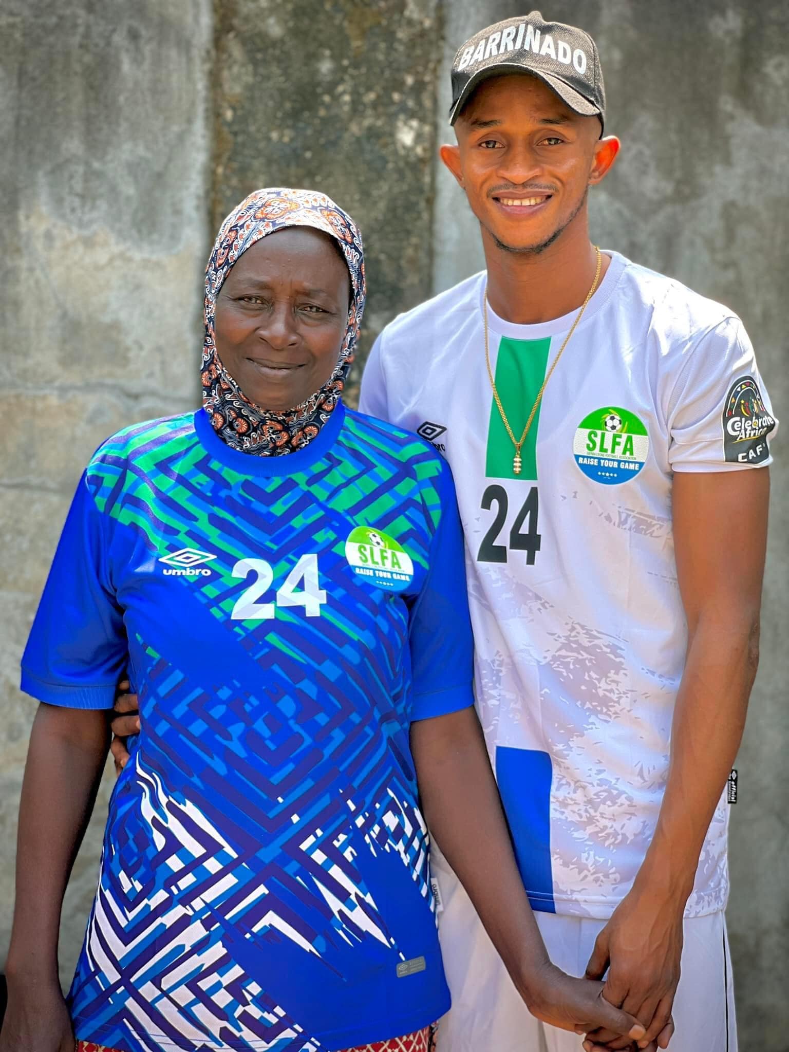 The winger  has shared an awesome photos of himself and his mother displaying  his Leone Stars Jersey After his AFCON participation. Barrie is among the Leone Stars players who were in Cameroon for the 2021 African Cup of Nations in Cameroon.