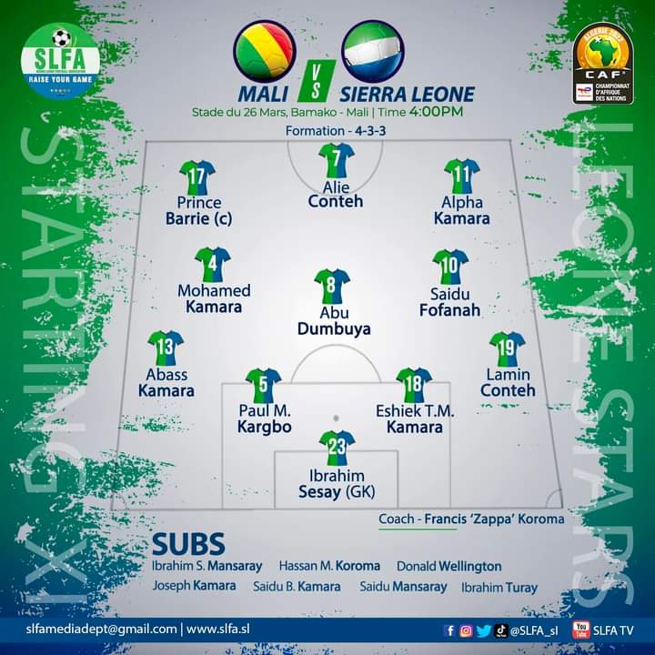Coach Francis Zappa Koroma has selected his starting 11 for the crucial Second leg tie against Mali, at the Malian stadium in Bamako.