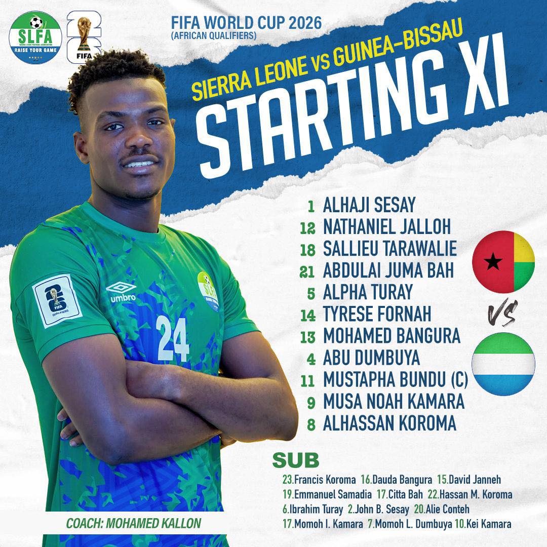 The Sierra Leone Football Association (SLFA) has announced the starting lineup for the highly anticipated 2026 FIFA World Cup African Qualifiers match against Guinea-Bissau.