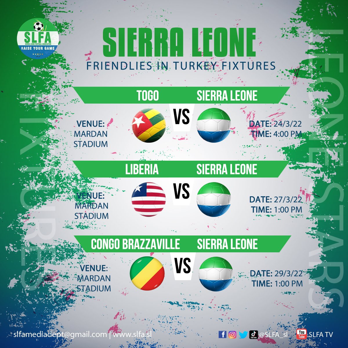 The Leone Stars of Sierra Leone will battle with the Sparrow Hawks of Togo in an International friendly game at the Mardan Sports Complex in Antalya Turkey on Thursday, 24th March.