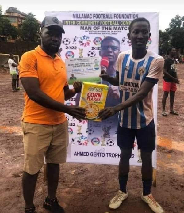 In the ongoing Gento trophy 2022 in Freetown at the Millamac Football Foundation Inter-Community Competition, a player was awarded Man of the Match with a box of cornflakes.