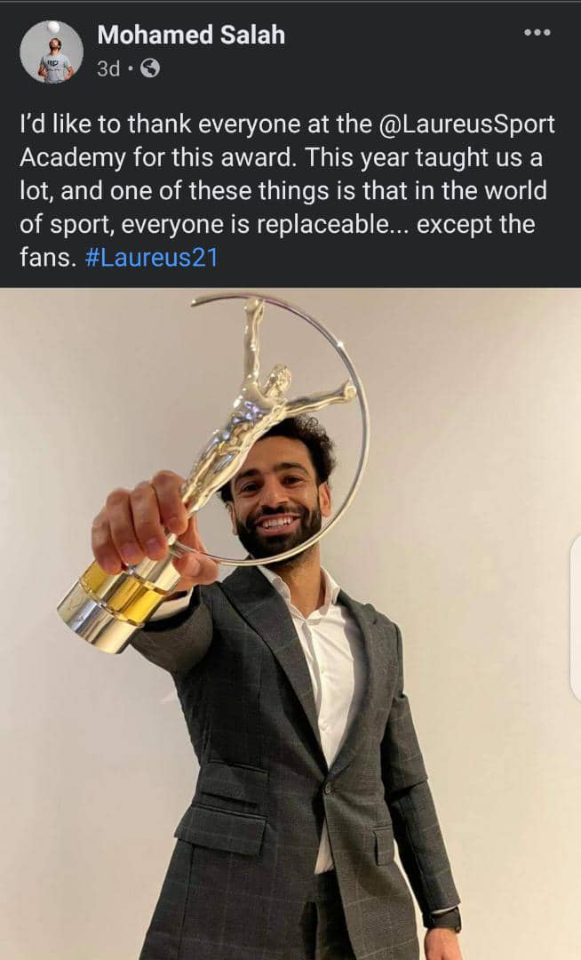 Salah was among several winners of the 2021 Laureus World Sports Awards unveiled at a virtual awards ceremony from Seville, Spain, on Thursday.