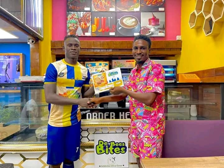 The General Manager and staff of De Bees Bites Fast Food Restaurant have awarded Musa Noah Kamara popularly known as Musa TOmbo a “Man of the Match” certificate and food package for the encounter between Kroo Town Road and Angola Town.