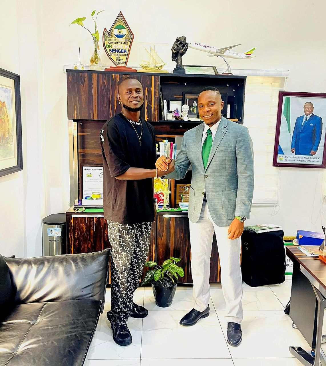 Sierra Leone’s star striker Musa Kamara, popularly known as Musa Tombo, paid a courtesy visit to Chief Minister Dr. David Moinina Sengeh on Thursday ahead of his impending transfer to Tunisian top-flight club CS Sfaxien.