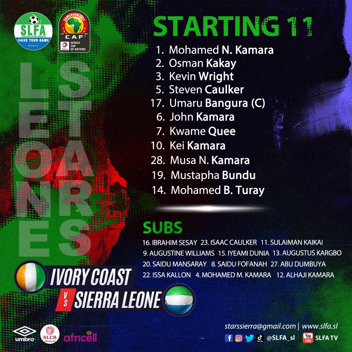 Leone Stars defensive midfielder John Bankole kamara is arguably one of the best in his position on the African continent and he is definitely going to start on today unless he breaks his legs before kickoff.