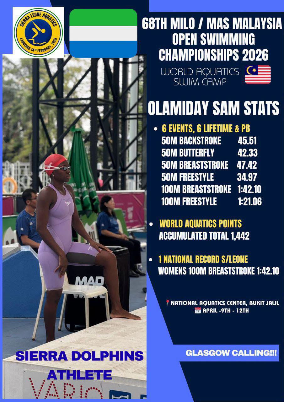Sierra Leonean swimmer Ola has been selected to represent the country at the upcoming Glasgow Commonwealth Games 2026 following a period of marked improvement in her performance since the Paris 2024 Olympics, supported by an international training scholarship.