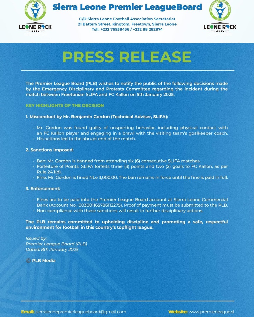 The fine must be deposited into the Premier League Board’s account at Sierra Leone Commercial Bank, with proof of payment submitted to the board. Failure to comply with these sanctions may result in additional disciplinary measures.
