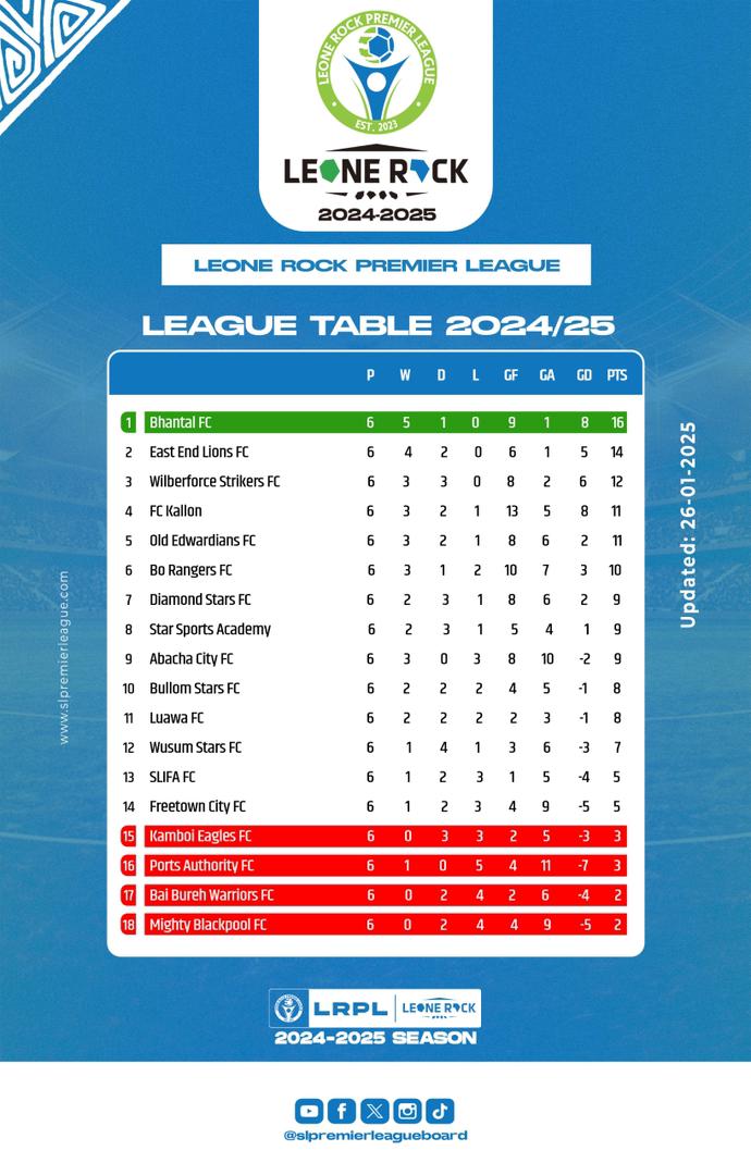 The Leone Rock Premier League 2024/25 season is heating up as teams battle for supremacy, and after six action-packed matchweeks, the league table paints an intriguing picture. Bhantal FC is sitting comfortably at the summit, with a commanding display of form that has earned them 16 points from six matches.