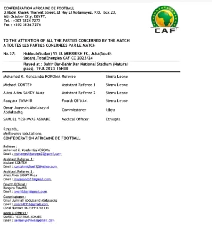Sierra Leonean referees quartet referees have been appointed to officiate match #No. 37 in the TotalEnergies CAF Confederations Cup first preliminary round qualifiers between Sudan’s Haidoub Al Nouhod and South Sudan El-Merriekh Juba.
