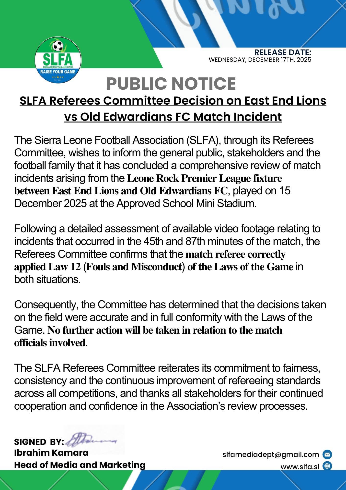 The Sierra Leone Football Association (SLFA), through its Referees Committee, has upheld the decisions taken by match officials during the Leone Rock Premier League fixture between East End Lions and Old Edwardians FC.