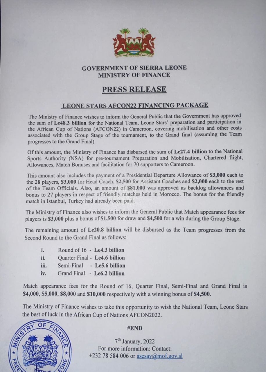 The Government of Sierra Leone through the Ministry of Finance has announced a  Le48.3 billion financing package for the Leone Stars participation in the African Cup of Nations (AFCON) in Cameroon.