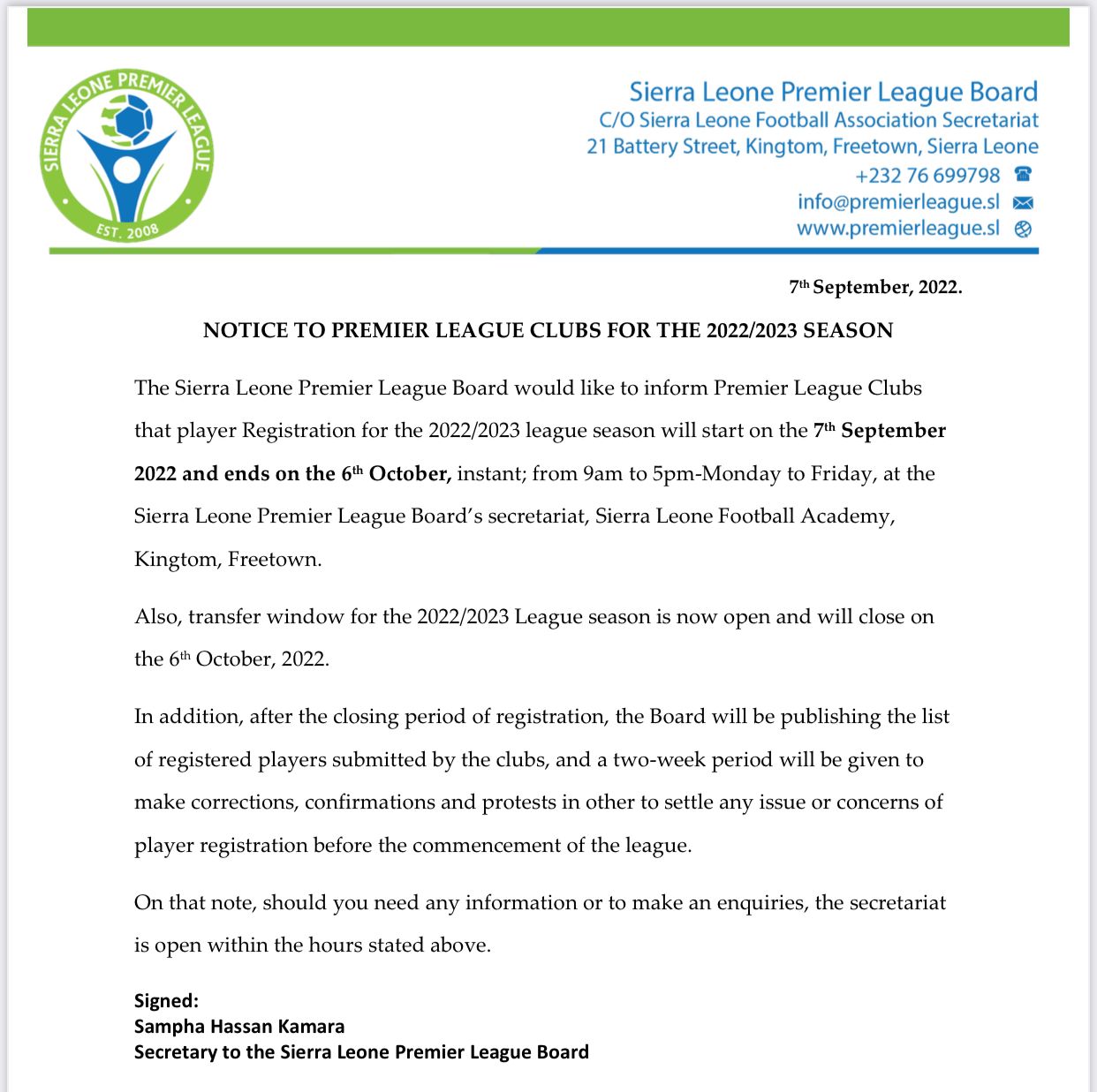 With regards to this, the secretary to the Sierra Leone Premier League Board in collaboration with the entire body, the Sierra Leone Premier League Board would like to inform Premier League Clubs that player registration for the 2022/2023 league season will start on the 7th September 2022 and ends on the 6th October, instant; from 9am to 5pm-Monday to Friday, at the Sierra Leone Premier League Board’s secretariat, Sierra Leone Football Academy, Kingtom, Freetown.