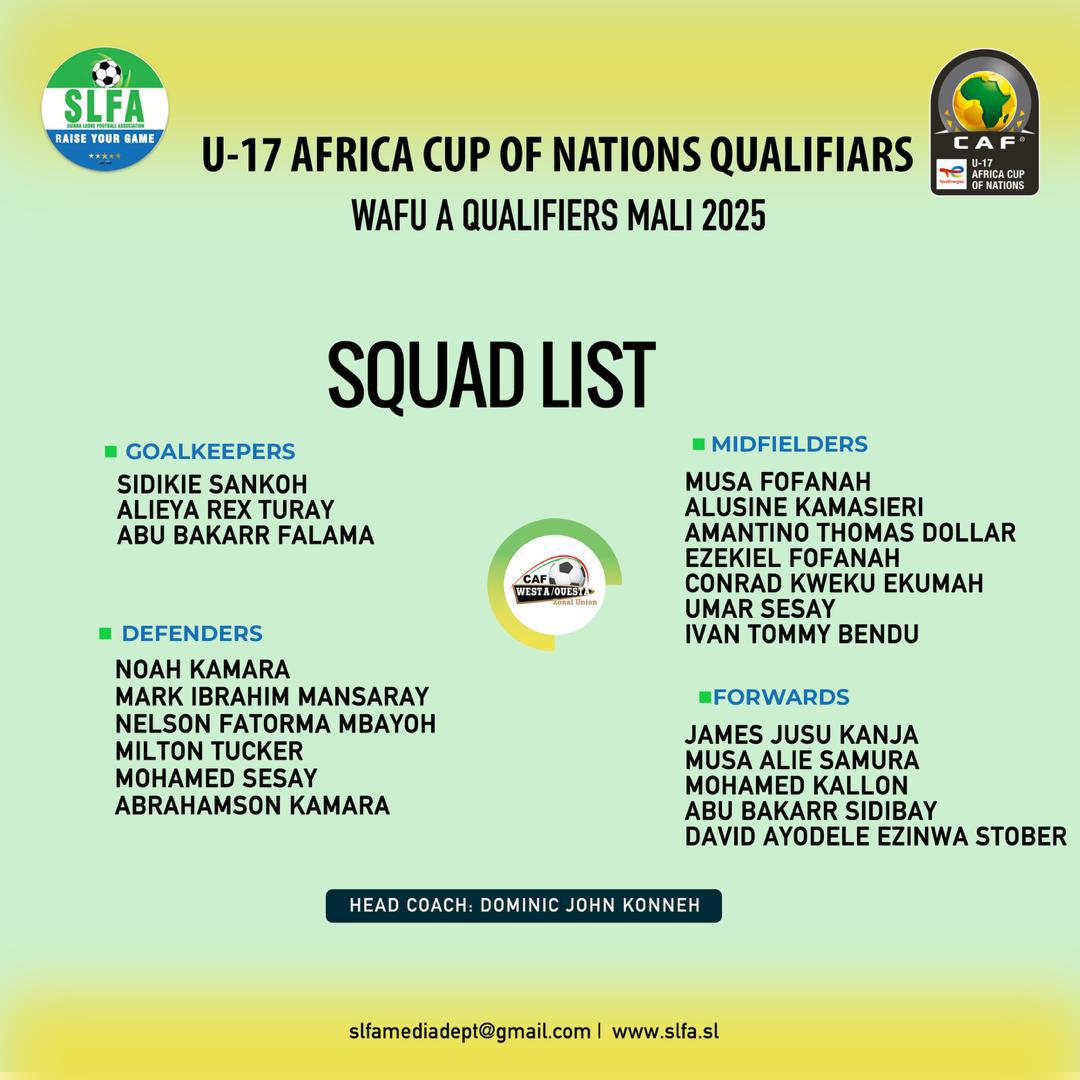 Head Coach Dominic John Konneh has unveiled a final 21-man squad for the National Under-17 Male Team, set to compete in the upcoming WAFU Zone A Tournament in Bamako, Mali.