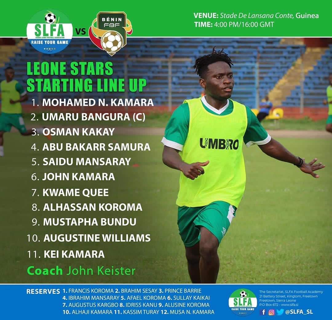 Sierra Leone Senior Football team Head coach, John keister has released the starting line up that will play against Benin today.