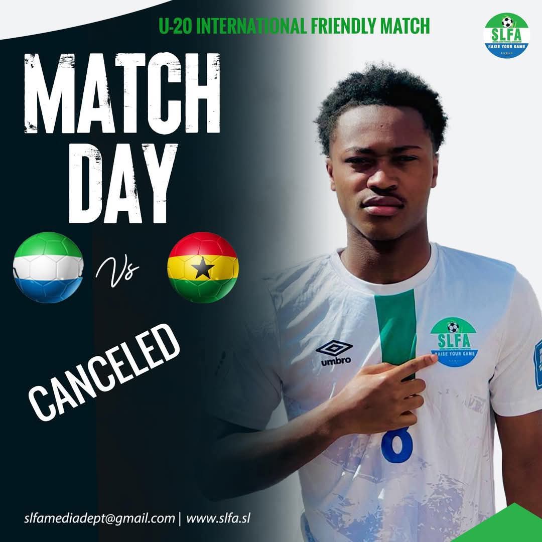 The Sierra Leone Football Association (SLFA) has announced the cancellation of the scheduled friendly match between the Sierra Leone U-20 national team, Shooting Stars, and the Ghana U-20 national team.