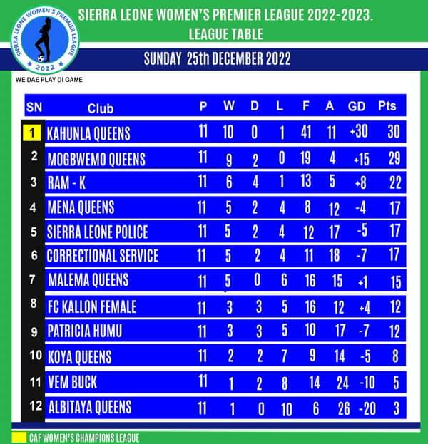 Sunday 25th December, 2022 was a memorable day for the Female Premier League as Kahunla Queens hosted Albitaya Queens from Kabala at the Kenema City field. The match ended on a 3:1 defeat against Albitaya Queens. This victory of the Kenema Queens ( Kahunla Queens FC) earned them 1st position on the league table.