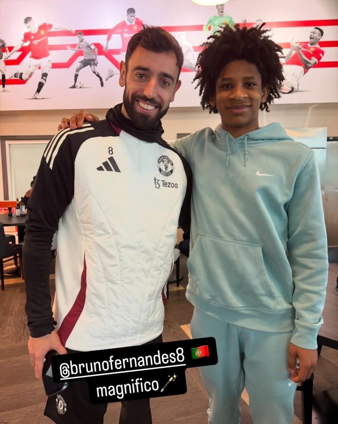The 14-year-old sealed his contract last week earning the iconic number 8 jersey which is currently worn by the Portuguese midfield maestro, Bruno Fernandes. The teenager, being a fan of United and Fernandes visited the Theatre of Dreams where he posed alongside the Portuguese.