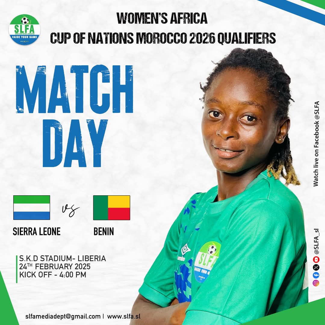 The match is set to kick off at 4:00 PM as Sierra Leone’s national women’s team aims to overturn a 2-1 deficit from the first leg and keep their WAFCON qualification hopes alive.