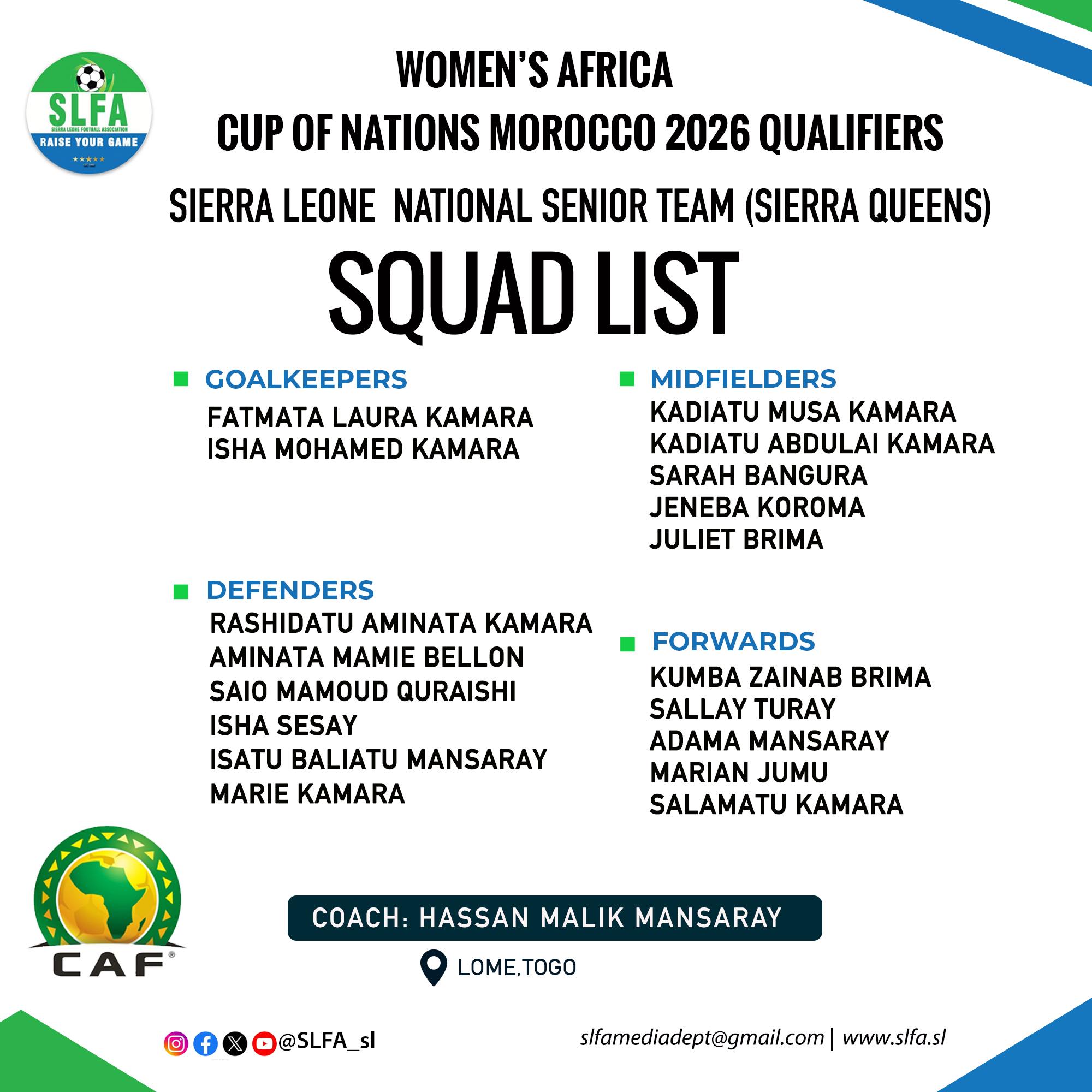 Head coach Hassan Malik Mansaray has officially named an 18-player squad for the upcoming matches.