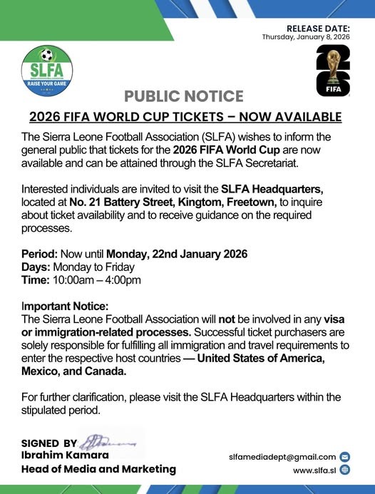 The Sierra Leone Football Association (SLFA) has commenced the sale of tickets for the 2026 FIFA World Cup at its Secretariat in Freetown.