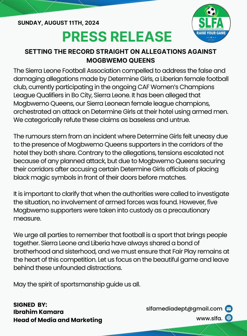In a press release issued on August 11th, 2024, the Sierra Leone Football Association (SLFA) firmly refuted allegations leveled against Mogbwemo Queens, the reigning female league champions of Sierra Leone, by Determine Girls, a Liberian female football club.