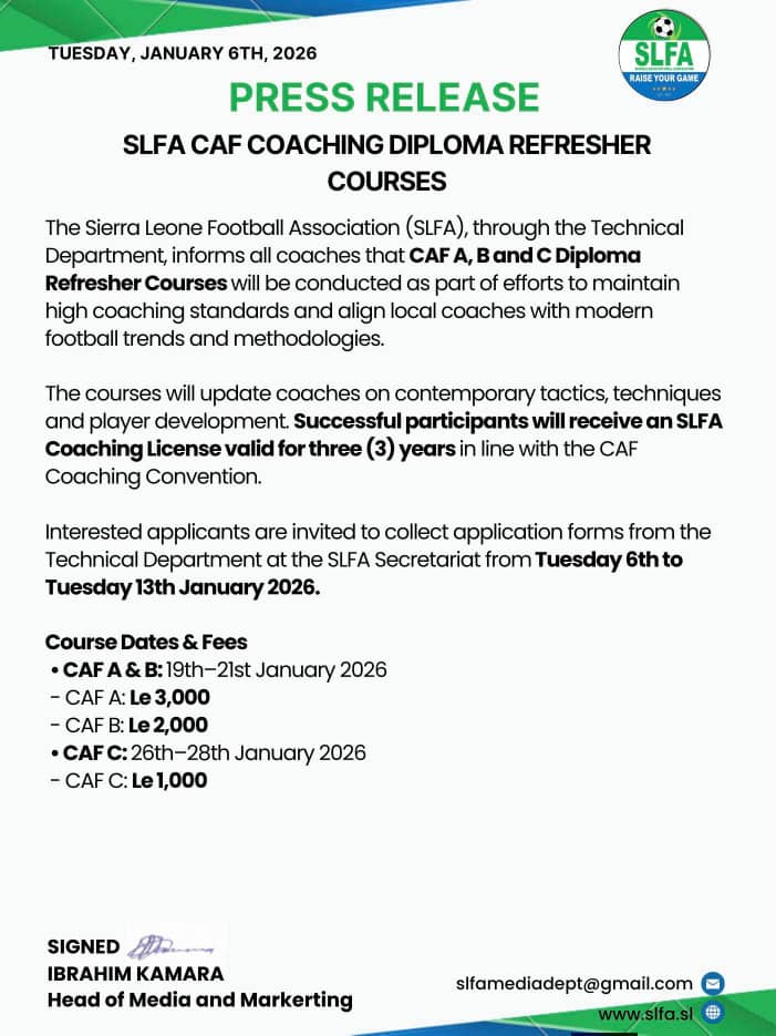 The Sierra Leone Football Association (SLFA), through its Technical Department, has announced the commencement of CAF Coaching Diploma Refresher Courses for 2026.