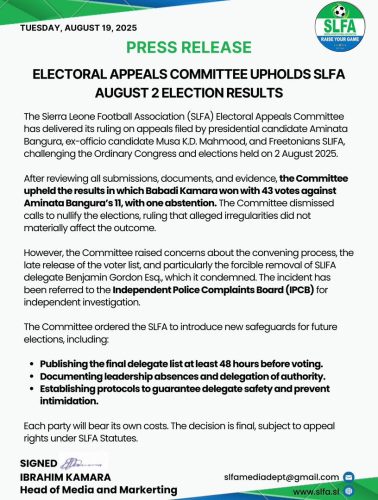 The Sierra Leone Football Association (SLFA) Electoral Appeals Committee has confirmed the results of the Ordinary Congress and elections held on 2 August 2025, dismissing challenges filed by presidential candidate Aminata Bangura, ex-officio candidate Musa K.D. Mahmood, and the Freetonians SLIFA.
