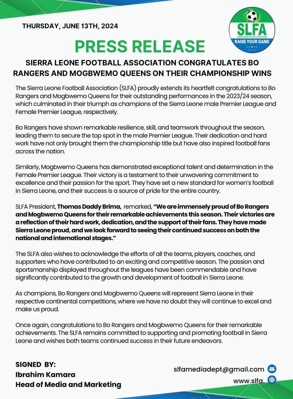 The Sierra Leone Football Association (SLFA) has issued a resounding congratulations to Bo Rangers and Mogbwemo Queens for their outstanding performances in the 2023/24 season, culminating in their championship titles in the Sierra Leone male Premier League and Female Premier League respectively.
