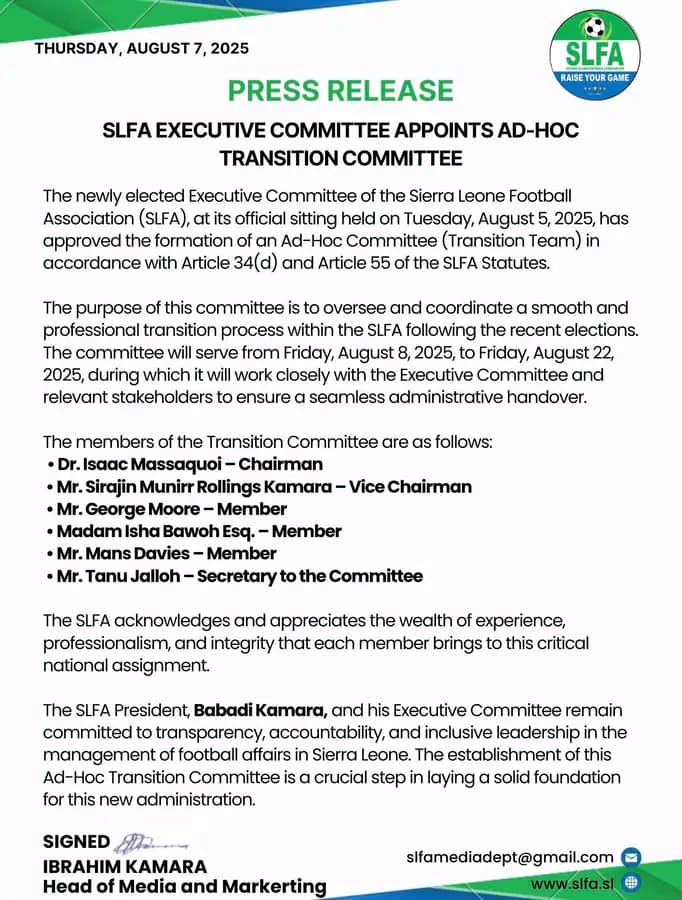 The newly elected Executive Committee of the Sierra Leone Football Association (SLFA) has officially approved the formation of an Ad-Hoc Transition Committee. The decision was made during its first formal sitting held on Tuesday, August 5, 2025.