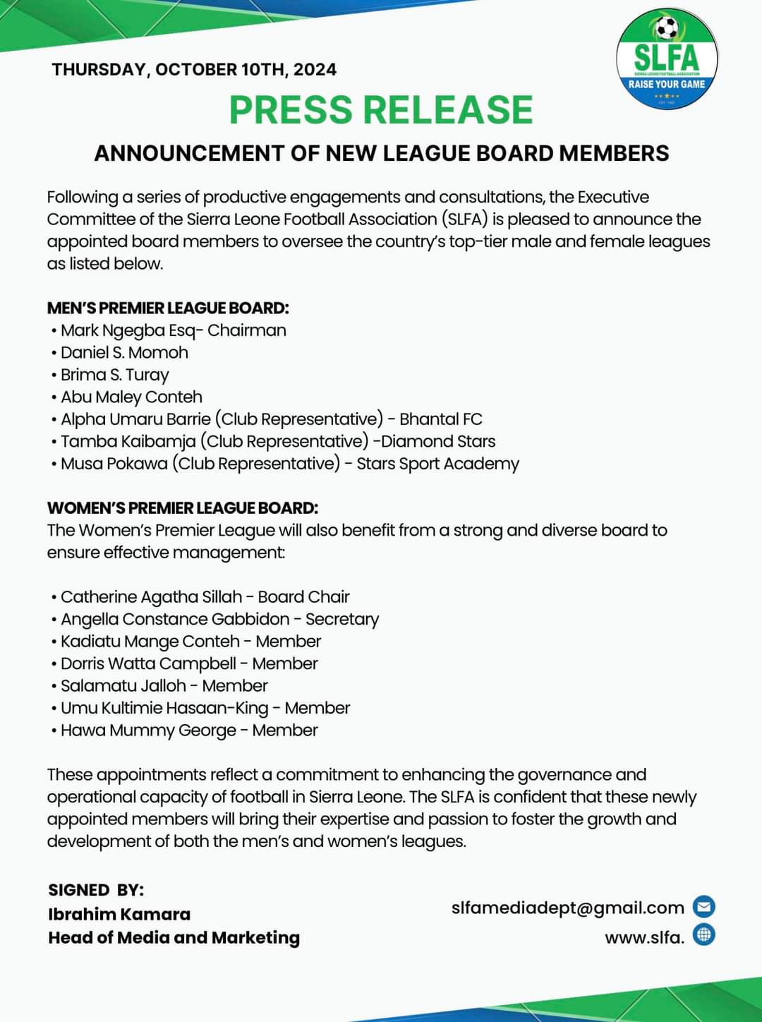 In a recent press release, the SLFA unveiled the appointed board members for both leagues, emphasizing the importance of strong leadership in fostering the growth and development of football in Sierra Leone.