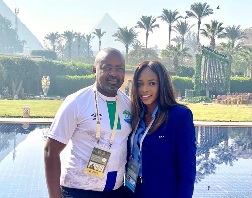The President of the Sierra Leone Football Association Thomas Daddy Brima attends his first CAF Extraordinary General Assembly at the home of CAF in Cairo, Egypt. Mr. Brima is in attendance with Former SLFA Boss, who is now a FIFA Council member and a CAF Executive Committee member Madam Isha Johansen.