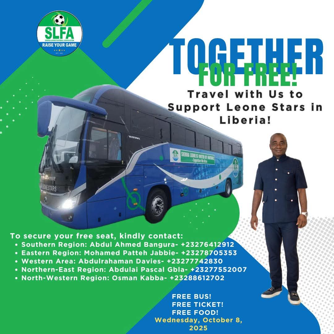 The Sierra Leone Football Association (SLFA), under the leadership of its President, Babadi Kamara, has announced the provision of free transportation for fans traveling to Monrovia, Liberia, to support the Leone Stars in their crucial 2026 FIFA World Cup Qualifier against Burkina Faso on Wednesday, October 8, 2025, at the Samuel K. Doe Stadium.