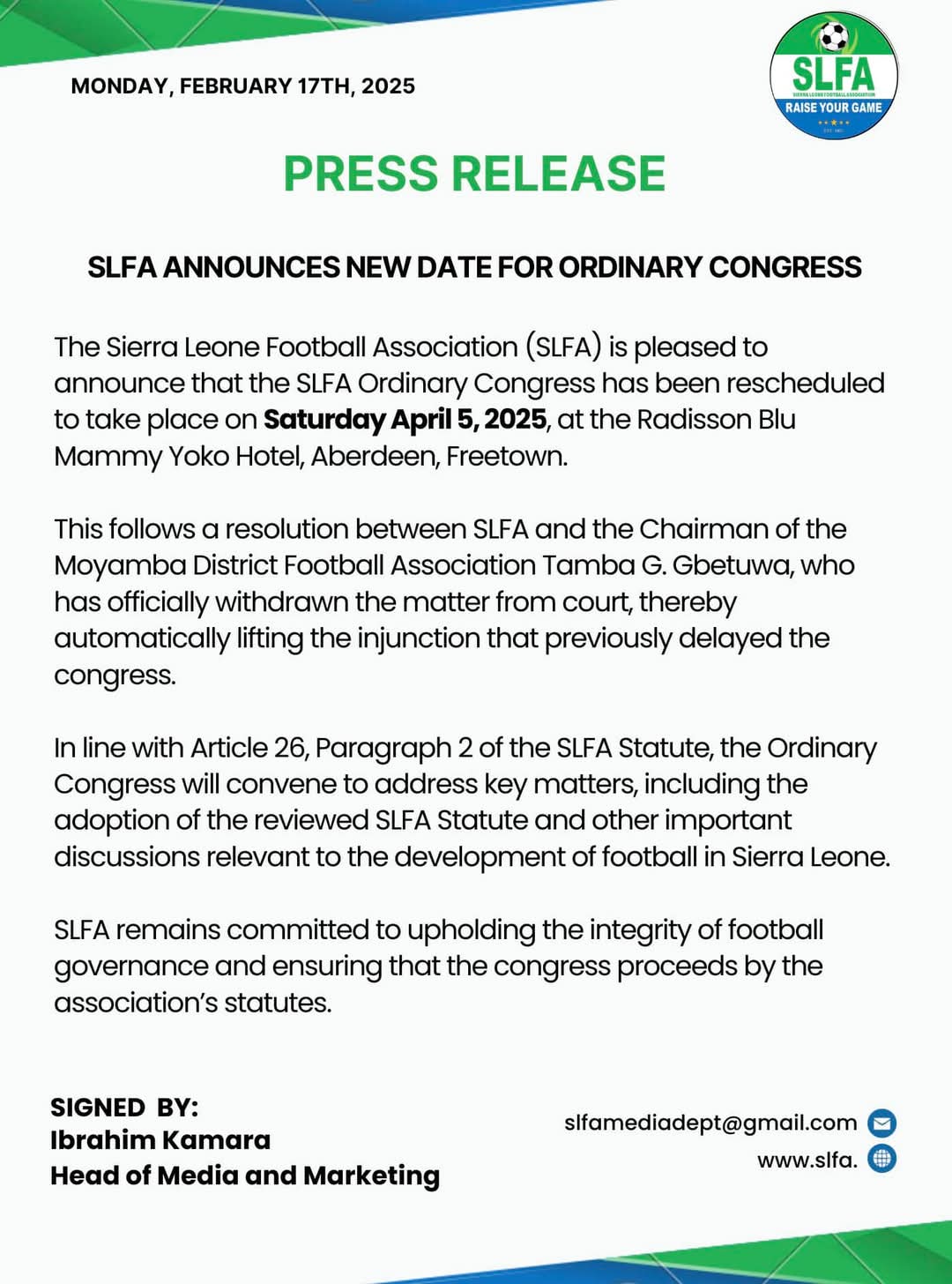 The Sierra Leone Football Association (SLFA) has set a new date for its long-awaited Ordinary Congress, now scheduled for Saturday, April 5, 2025, at the Radisson Blu Mammy Yoko Hotel in Aberdeen, Freetown.