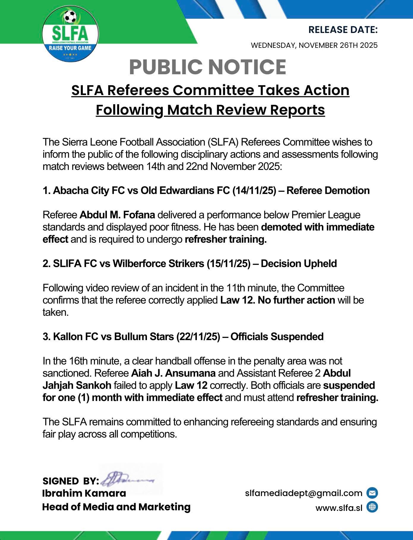 The Sierra Leone Football Association (SLFA) Referees Committee has announced a series of disciplinary measures and performance assessments following official match reviews conducted between 14th and 22nd November 2025.