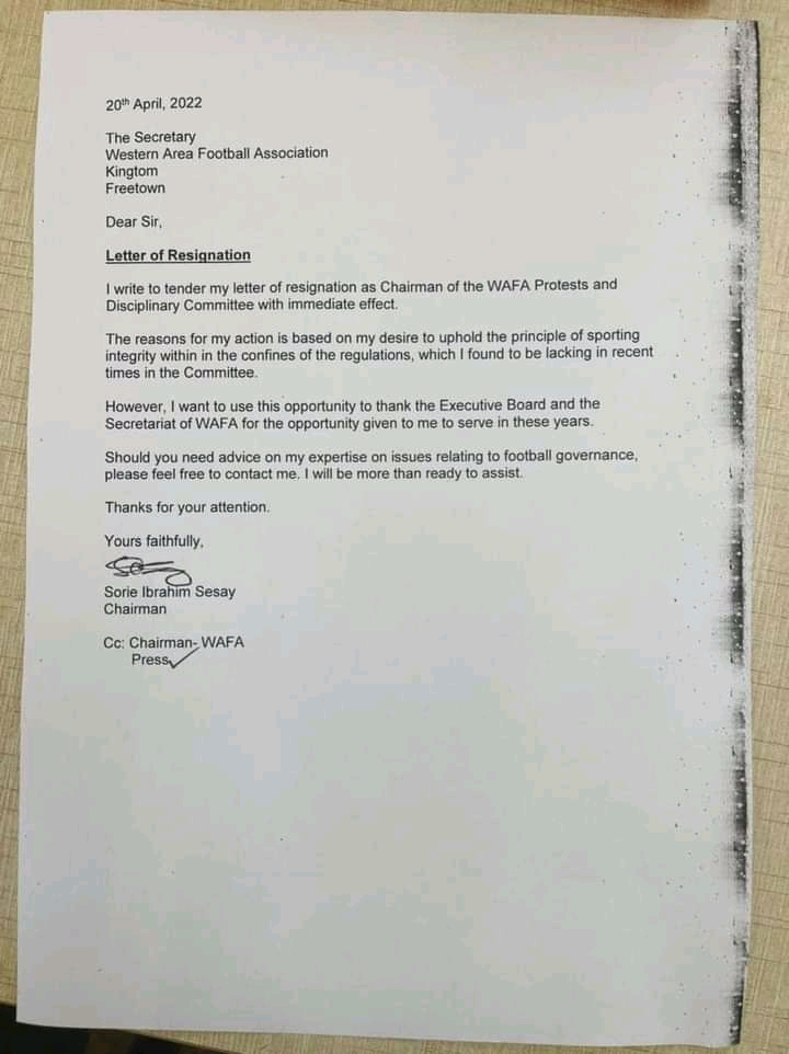 Sierra Leone Football Association, Head of Competitions Sorie Ibrahim Sesay has resigned his position as chairman of WAFA protest and disciplinary committee with immediate in a letter dated April 20, 2022 .