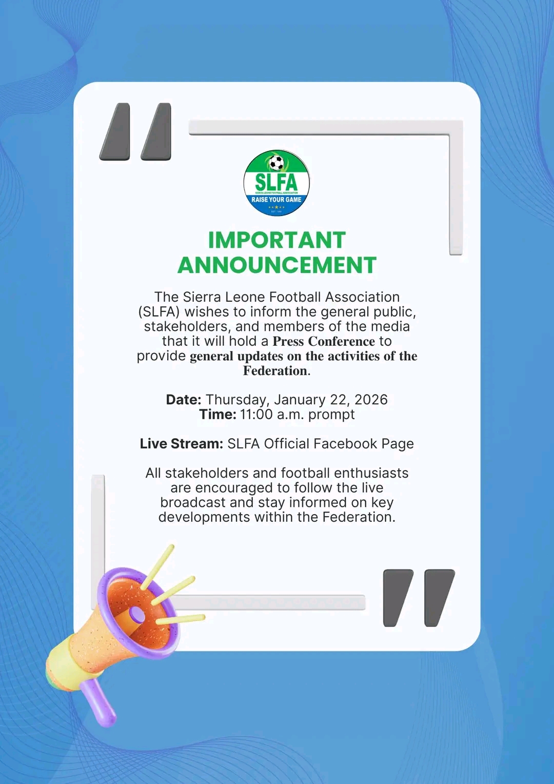 The Sierra Leone Football Association (SLFA) has announced that it will hold a press conference to update the public, key stakeholders, and members of the media on the Federation’s activities.