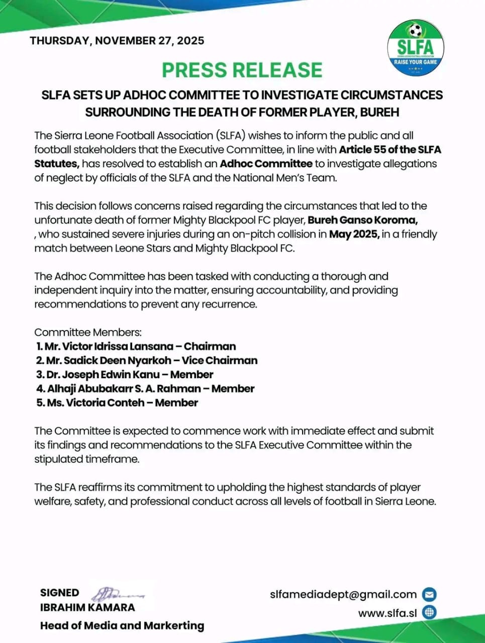 The Sierra Leone Football Association (SLFA) has announced the formation of an Adhoc Committee to investigate allegations of neglect relating to the death of former Mighty Blackpool midfielder, Bureh Ganso Koroma.