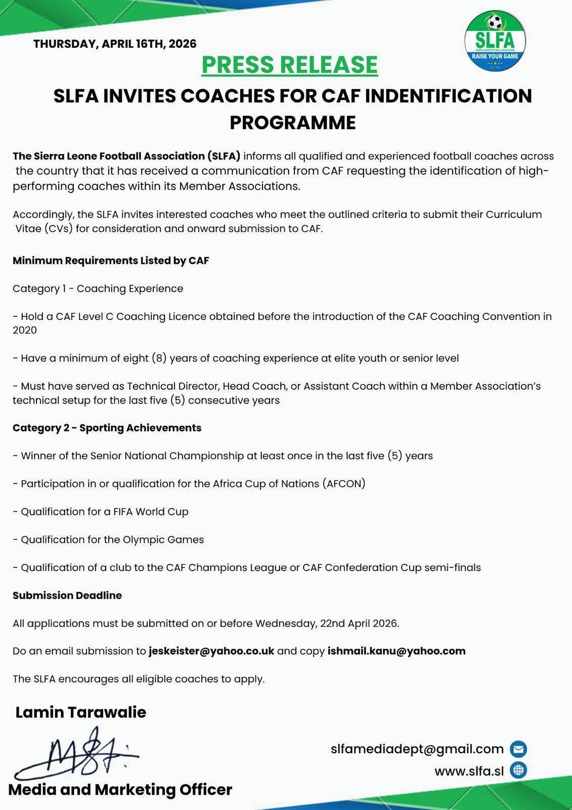 The Sierra Leone Football Association (SLFA) has officially opened applications for elite local coaches to be considered for a prestigious identification programme spearheaded by the Confederation of African Football (CAF).
