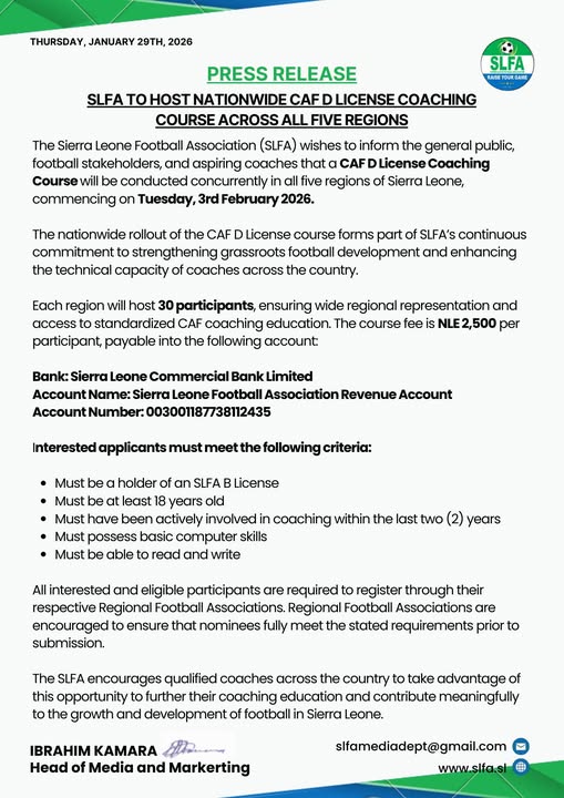 The Sierra Leone Football Association (SLFA) has announced plans to host a nationwide CAF D License Coaching Course across all five regions of the country, beginning on Tuesday, 3rd February 2026.