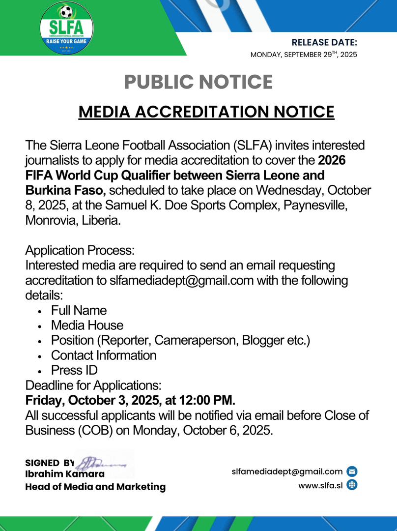 The Sierra Leone Football Association (SLFA) has officially opened media accreditation for journalists and media personnel wishing to cover the 2026 FIFA World Cup Qualifier clash between Sierra Leone and Burkina Faso.