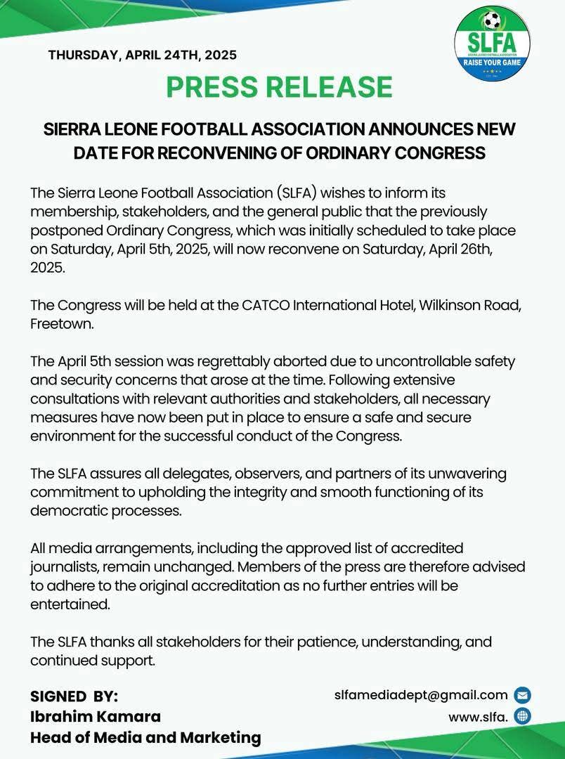The Sierra Leone Football Association (SLFA) has announced that its previously postponed Ordinary Congress will now reconvene on Saturday, April 26th, 2025, at the CATCO International Hotel, Wilkinson Road, Freetown.