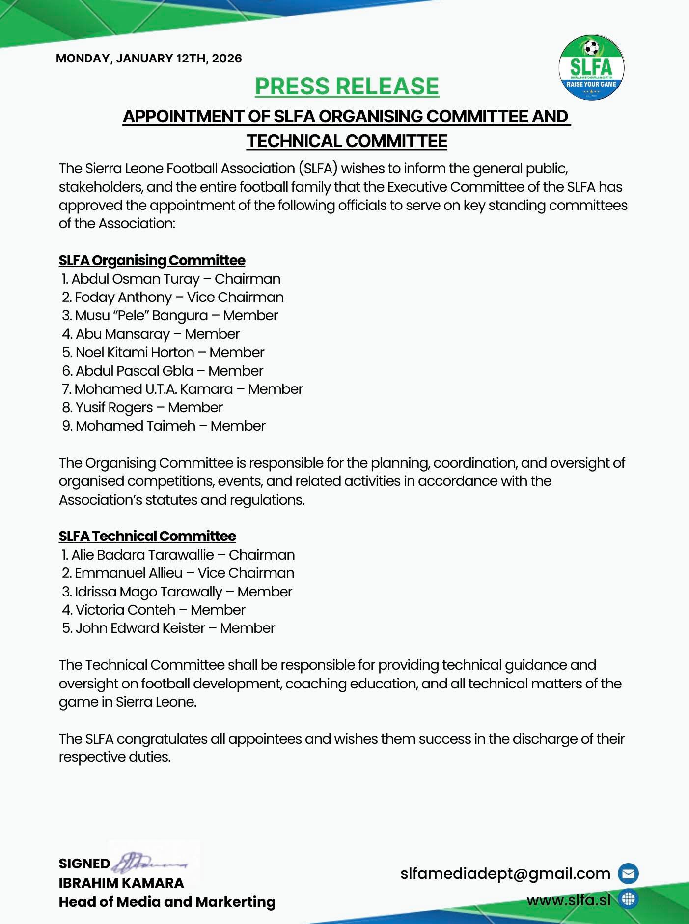 In the release, the SLFA announced that Abdul Osman Turay has been appointed Chairman of the Organising Committee, with Foday Anthony serving as Vice Chairman. The other members of the committee are Musu “Pele” Bangura, Abu Mansaray, Noel Kitami Horton, Abdul Pascal Gbla, Mohamed U.T.A. Kamara, Yusif Rogers and Mohamed Taimeh.