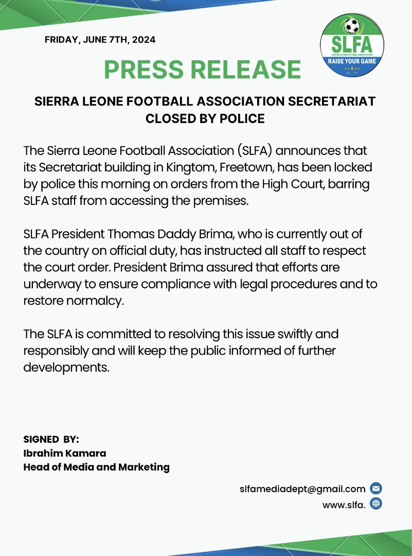 The Sierra Leone Football Association (SLFA) has announced the unexpected closure of its Secretariat building in Kingtom, Freetown. This morning, police enforced a High Court order to lock the premises, preventing SLFA staff from accessing the building.