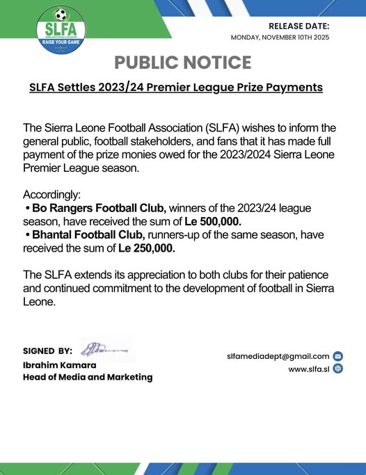 According to a public notice issued on Monday, November 10th, 2025, the association confirmed that Bo Rangers Football Club, winners of the 2023/24 league season, have received Le 500,000, while Bhantal Football Club, runners-up of the same season, have received Le 250,000.