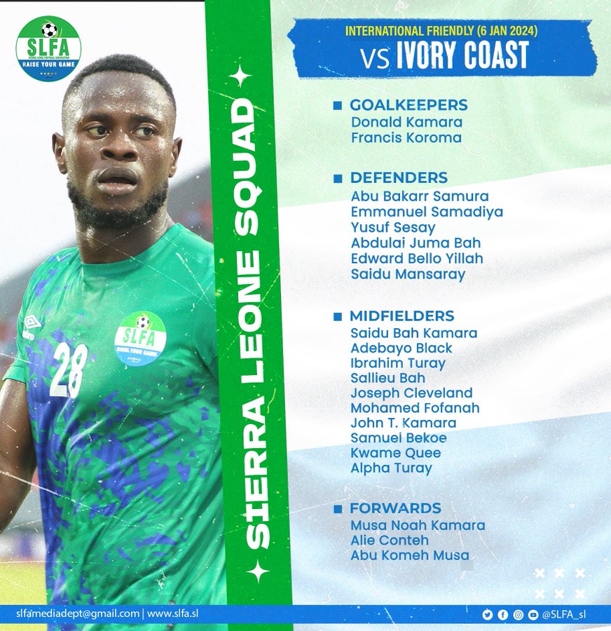 The Sierra Leone Football Association has announced a list of 21-man squad to face the Elephants of Ivory Coast in an international friendly on Saturday, January 6th, 2024 at the Laurent Pokou Stadium in Abidjan.