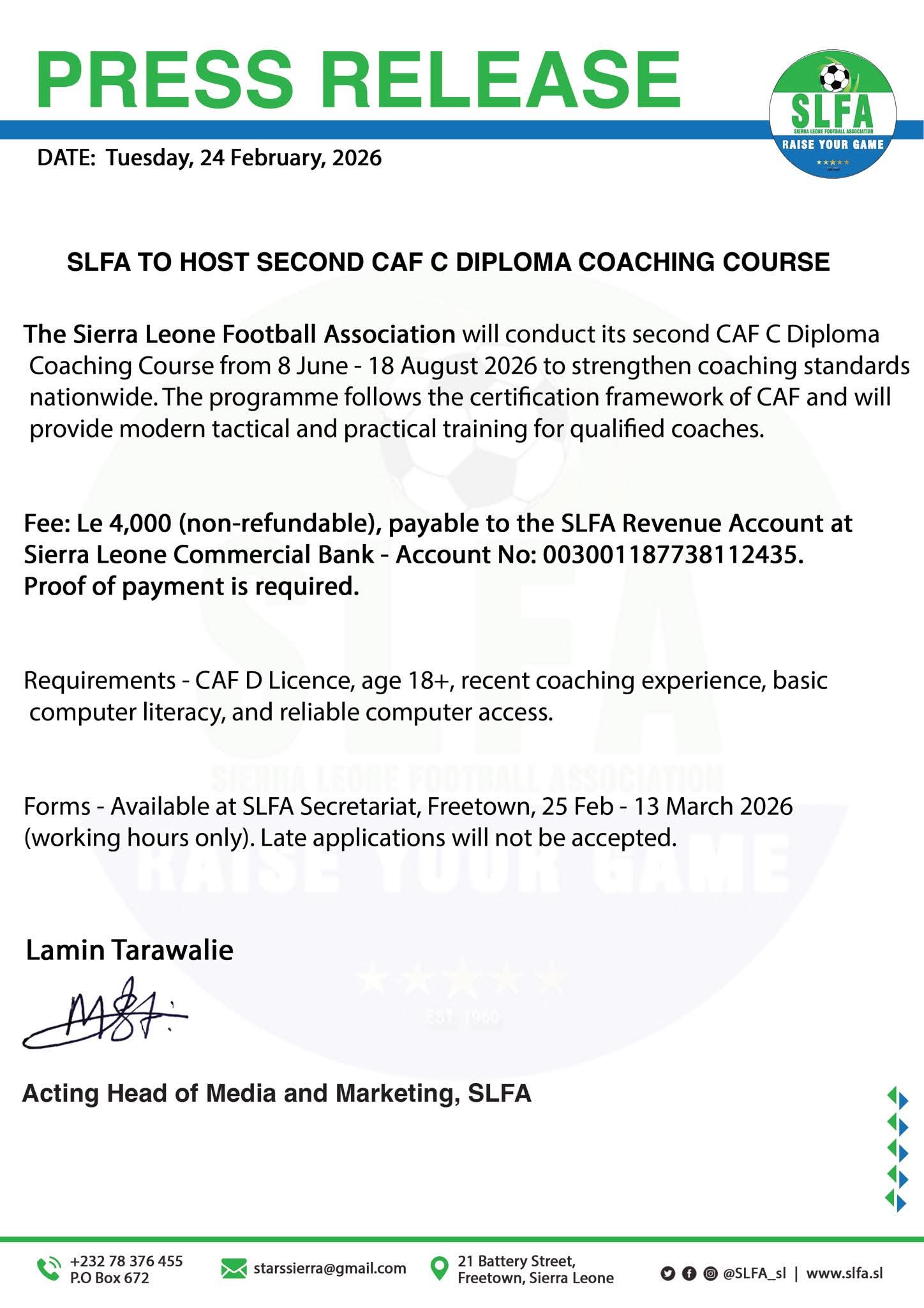 The Sierra Leone Football Association (SLFA) has announced that it will host its second CAF C Diploma Coaching Course from 8 June to 18 August 2026, aimed at strengthening football coaching standards across the country.