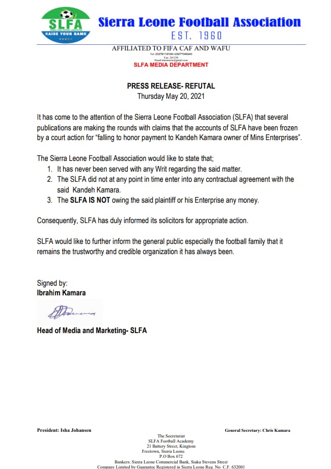 “It has come to the attention of the Sierra Leone Football Association (SLFA) that several publications are making the rounds with claims that the accounts of SLFA have been frozen by court action for “falling to honor payment to Kandeh Kamara owner of Mins Enterprises”.