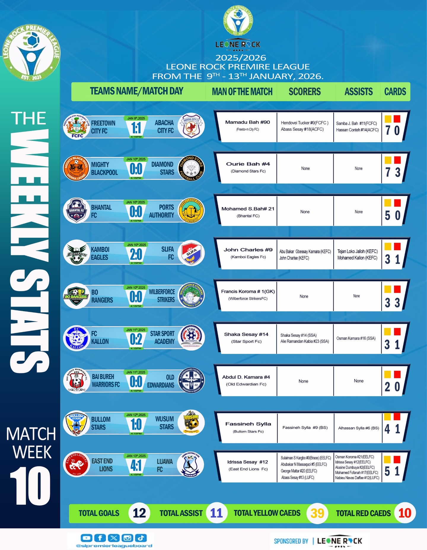 The weekend’s action saw crucial individual performances. East End Lions FC secured an important 3-1 win, powered by a Man of the Match display from Idrissa Sesay (#12), who contributed a goal and an assist. Bullom Stars’ victory was spearheaded by Fassineh Sylla, who scored and assisted to claim the matchday honours.