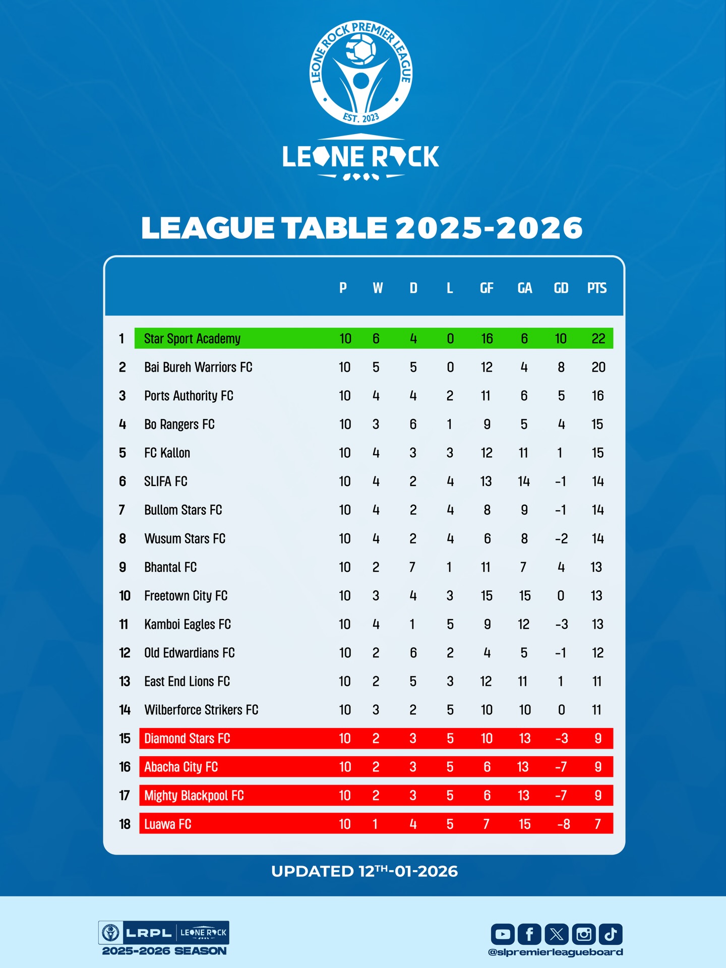 Star Sport Academy remains at the summit with 22 points, but their lead is under pressure. Bai Bureh Warriors FC, undefeated this season, sit just two points behind in second place after a solid 2-0 victory over Old Edwardians this weekend. Ports Authority FC holds third with 16 points.